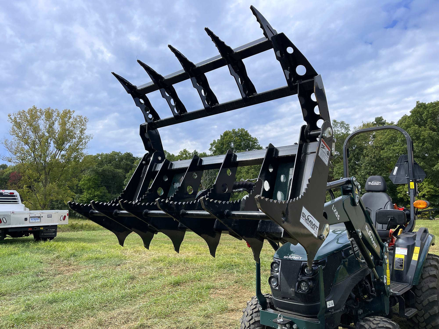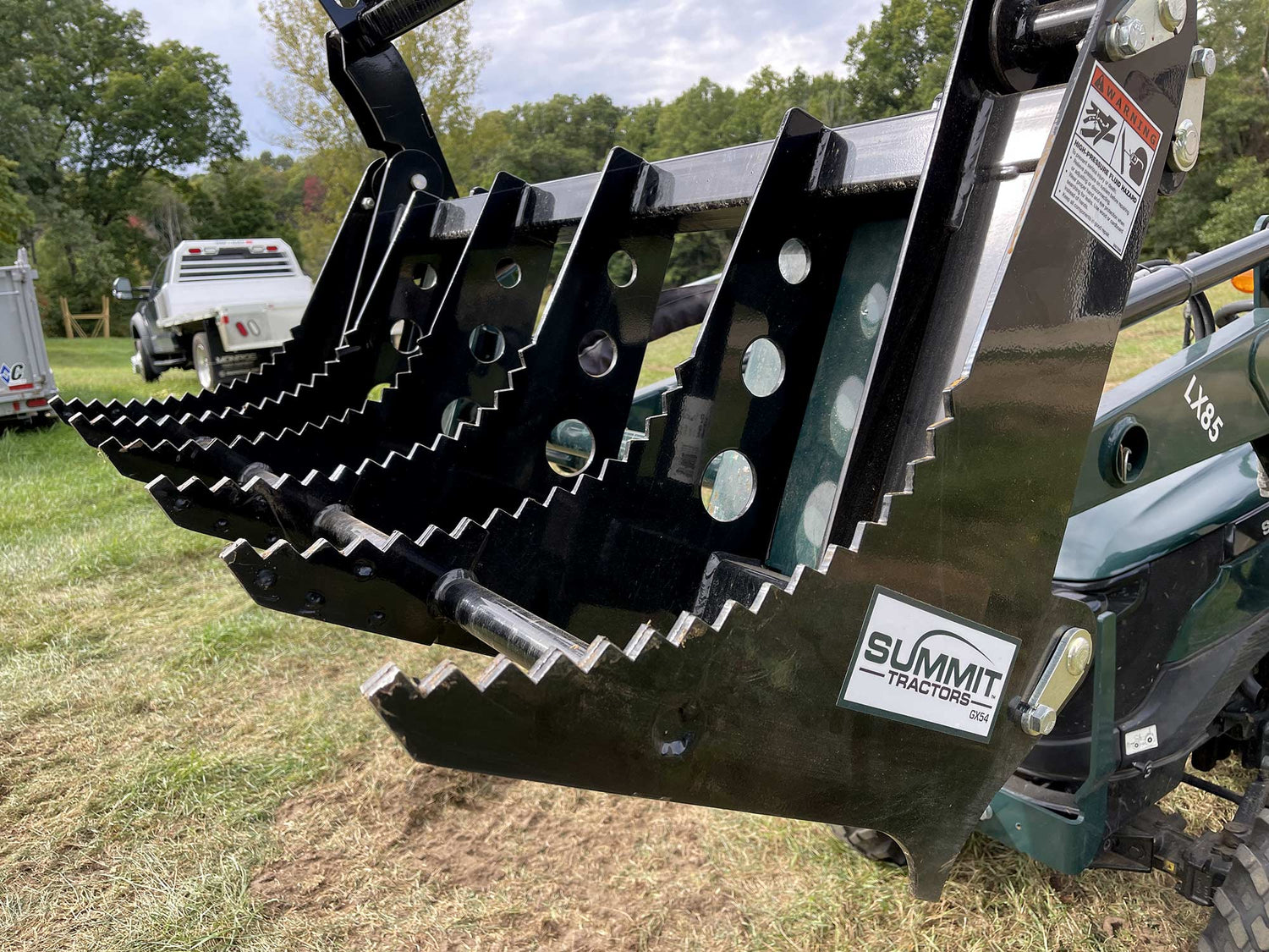 The Summit GX Series Grapples are made in the USA and feature dual hydraulic cylinders, protected sleeve hydraulic hoses, gusseted teeth, laminated and serrated tines, powder coat finish and greaseable pins
